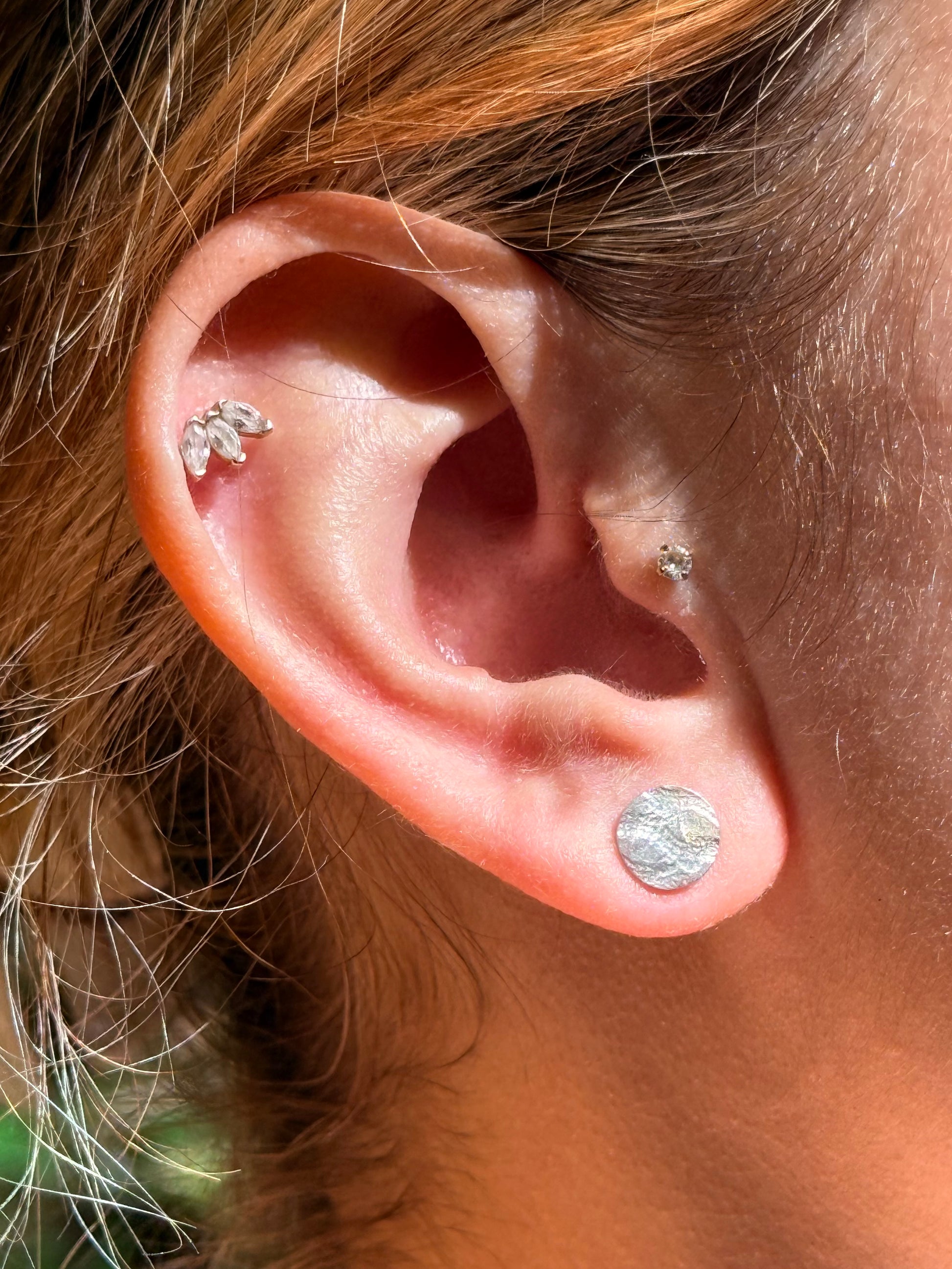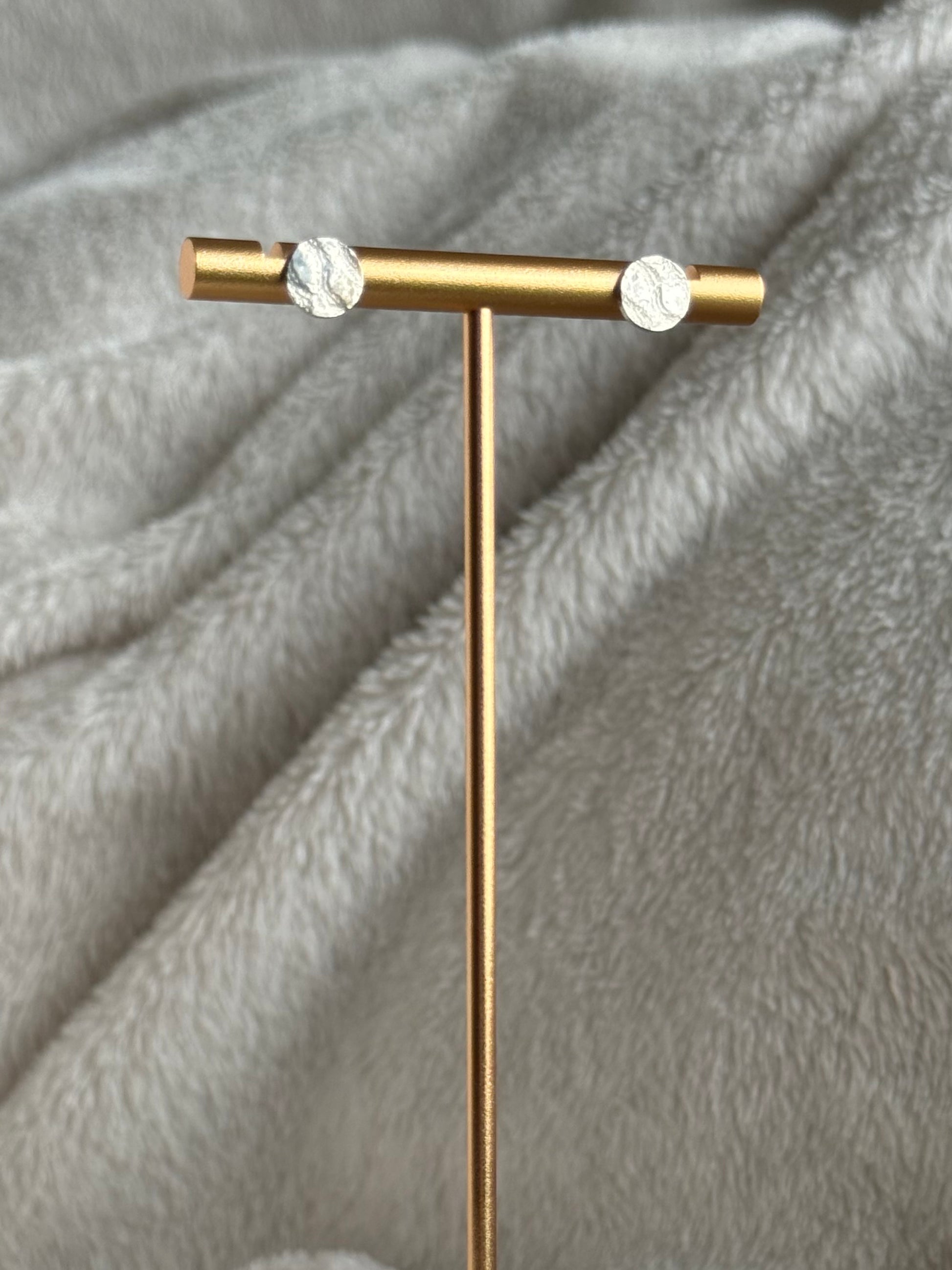 Subtiles et élégantes, les Boucles d’oreilles Ares sont façonnées à la main en argent 925. Chaque boucle est ornée d’une pastille ronde texturé qui capte délicatement la lumière et crée un bijou à la fois raffiné et aérien.