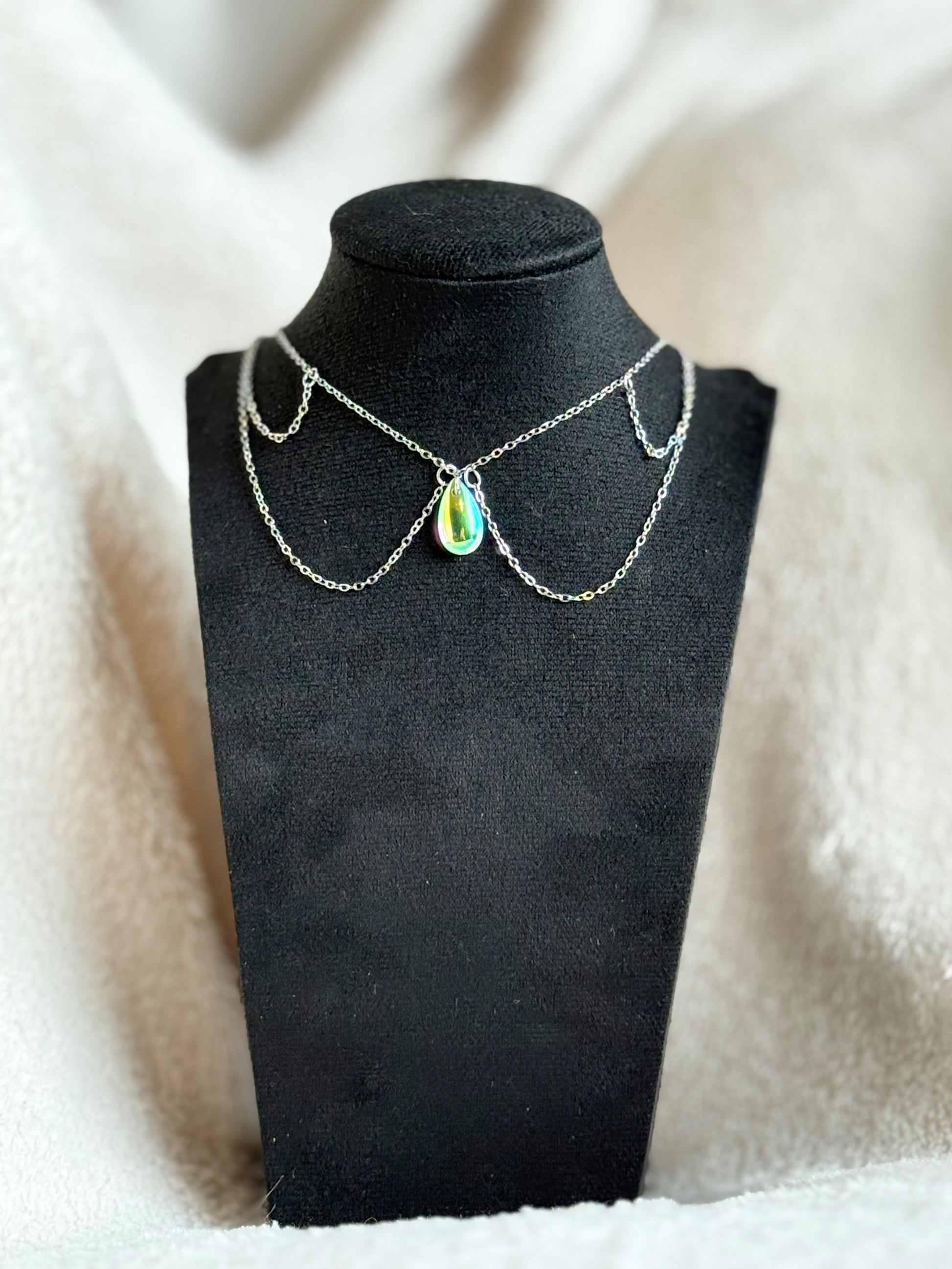 La pièce maîtresse est une magnifique perle en forme de goutte d'eau suspendu avec délicatesse au centre du collier.