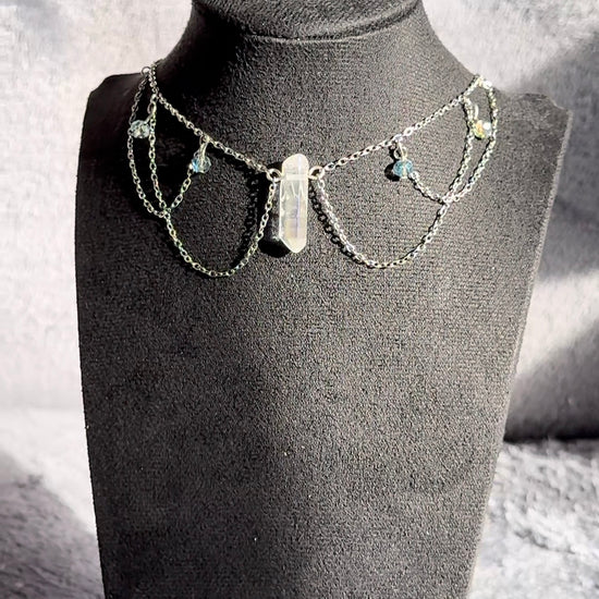 Le collier Nymeria n'est pas qu'un simple ornement, c'est un fragment de ciel capturé à l'heure bleue. De fines chaînes d'argent en acier inoxydable, tissées comme des fils de lune, dessinent de gracieuses guirlandes sur la peau, imitant la chute d'une pluie d'étoiles filantes.